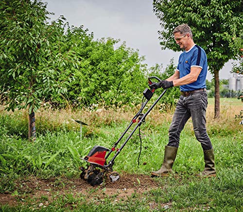 MOTOR POTENTE: La motoazada eléctrica para jardín DELTAFOX cuenta con un potente motor de 1500 vatios y puede ajustarse a 3 anchos de trabajo 19/32,5/43,5 cm (hasta 24 cuchillas de azada), permitiendo un uso flexible.